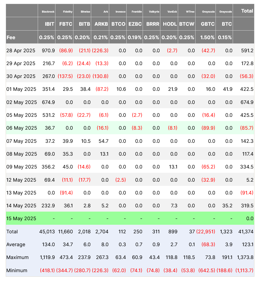 Впечатляющая 20-дневная полоса чистого притока IBIT подошла к концу накануне-13 мая-когда он зарегистрировал приток «0» в день. Продукт BlackRock Bitcoin до сих пор не видел отток с 9 апреля-более пяти недель назад.