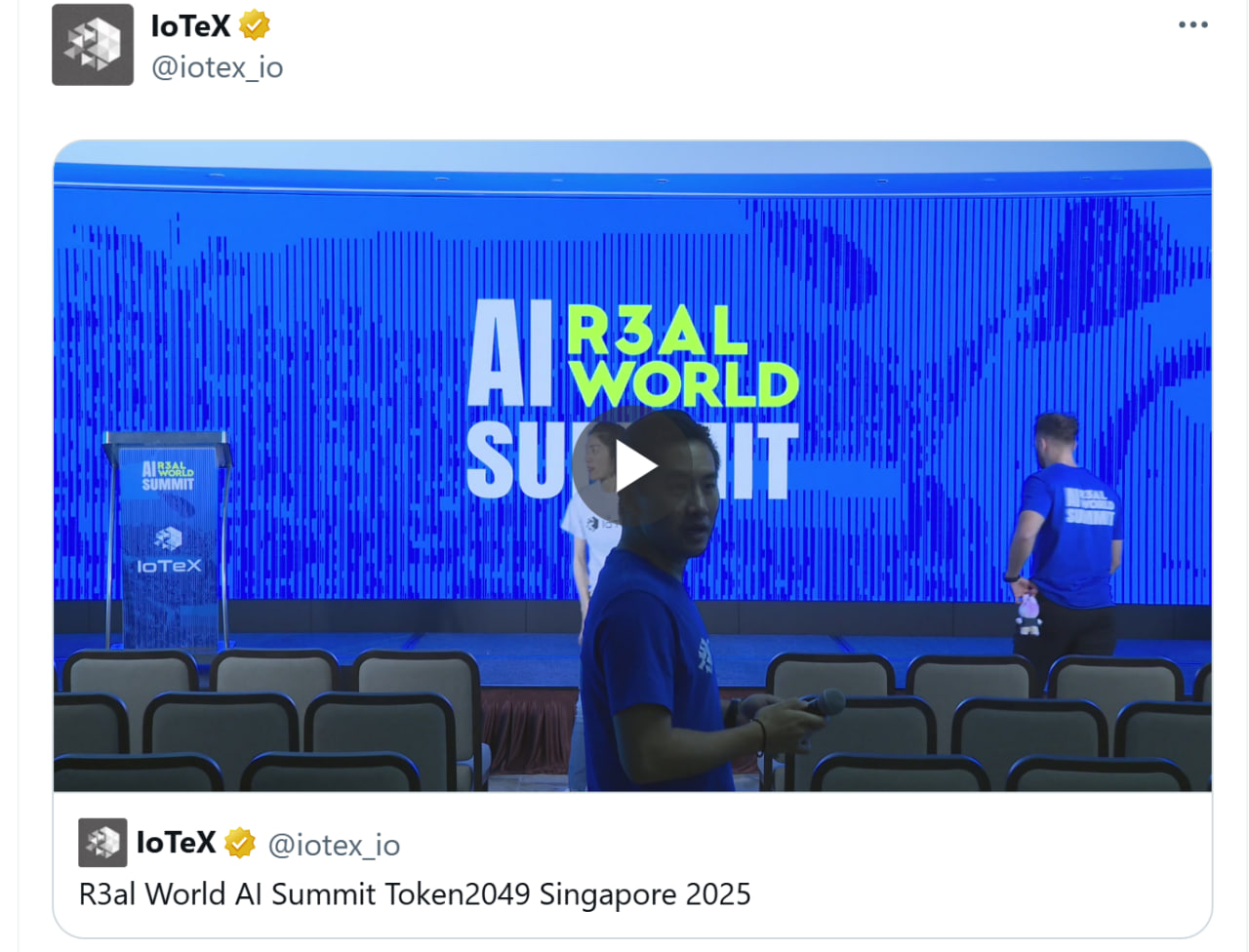 На вершине AI R3AL World AI на конференции Token2049 Iotex представила проект в сотрудничестве с группой партнеров по выравниванию основополагающих, включая Vodafone, Ассоциацию блокчейна, Filecoin, Theta Network, Aethir и других.