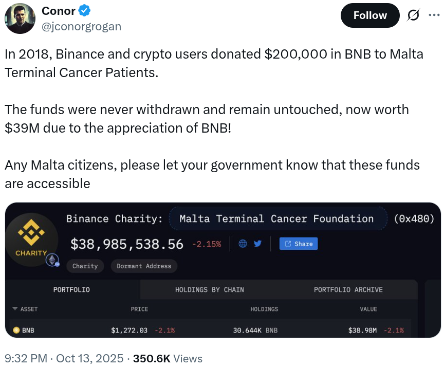 Пожертвование в криптовалюте в размере 200 000 долларов, сделанное Binance и пользователями мальтийской благотворительной организации для неизлечимо больных раком в 2018 году, теперь стоит около 37 миллионов долларов, но остается нетронутым.