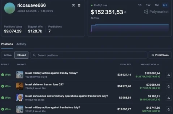 Сообщается, что на счету были поставлены десятки тысяч долларов и прибыль составила более 152 300 долларов США, делая ставки на такие рынки, как «Удар Израиля по Ирану 24 июня» и «Военные действия Израиля против Ирана к пятнице», причем последняя из двух ставок выиграла более 128 700 долларов США.