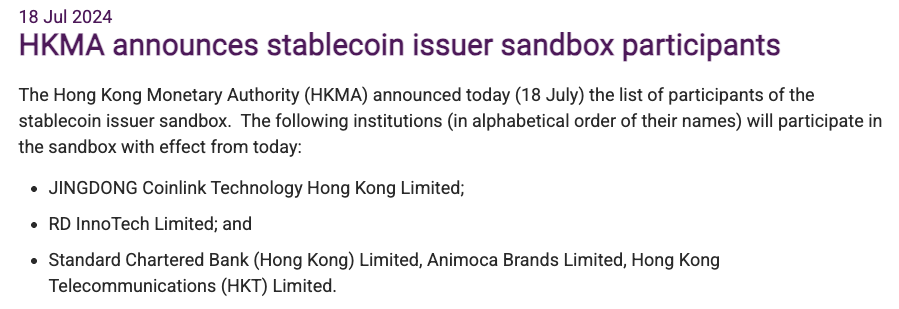 JD Coinlink является одним из официальных участников программы песочницей эмитента Stablecoin, проведенной Монетарным управлением Гонконга (HKMA), которая была запущена в прошлом году.