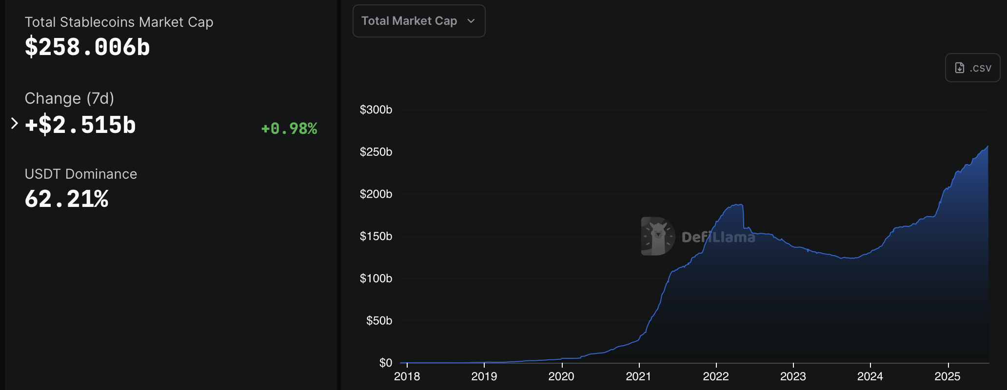 По словам Дефолламы, нынешняя рыночная капитализация стаблеки составляет 258 миллиардов долларов. Рынок вырос на 58% с 16 июля 2024 года, когда он был оценен в 163,3 млрд долларов.