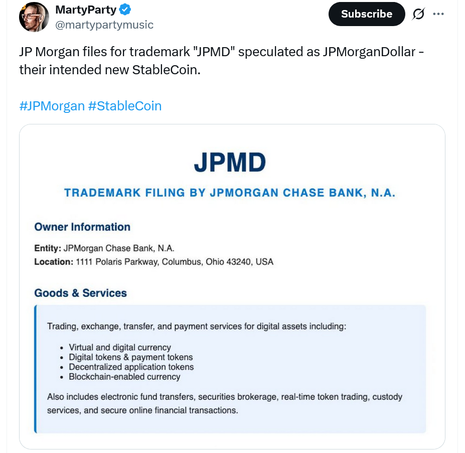 JPMorgan Chase подала новое приложение для товарных знаков в США для «JPMD» – сигнализируя о потенциальном расширении своих услуг блокчейна и криптовалюты и усиливающего спекуляции предложения стабилкой.