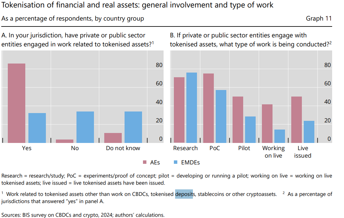 Согласно опросу Банка международных расчетов (BIS), проведенному в 2024 году, по крайней мере треть опрошенных коммерческих банков запустили, опробовали или исследовали токенизированные депозиты.