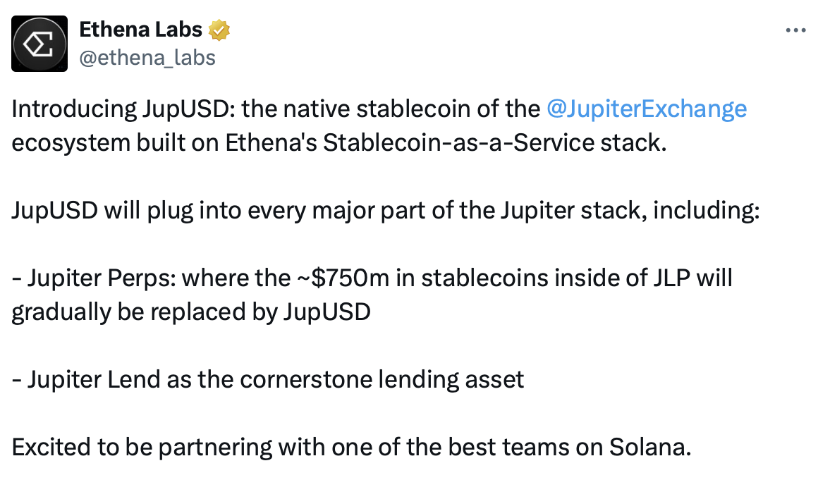 Jupiter, децентрализованная торговая платформа на Солане, объявила о планах запустить свой стейблкоин в партнерстве с Ethena Labs.