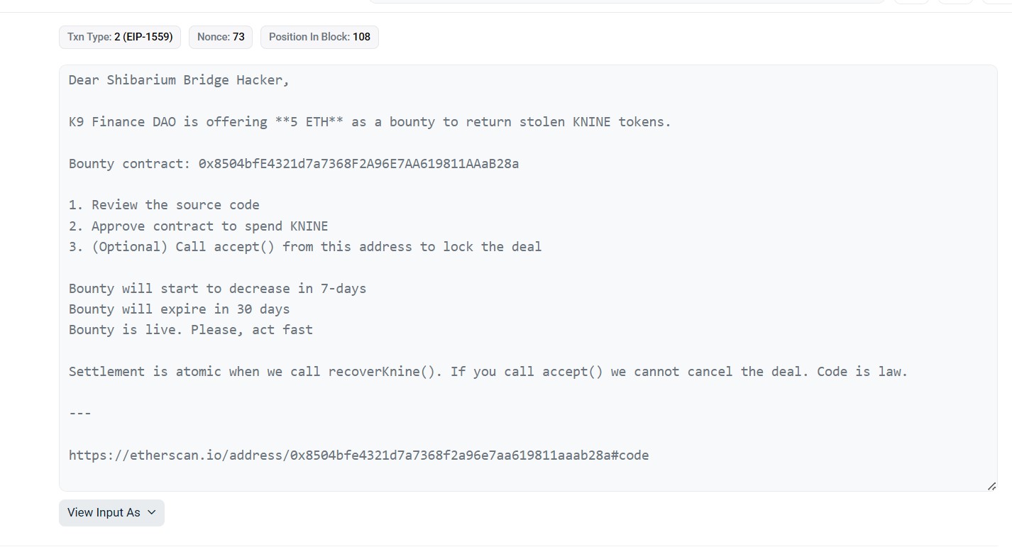 Децентрализованная финансовая платформа Shiba Inu в сети Shibarium Layer-2 предложила 5-й эфирной (23 000 долл. США) награду злоумышленнику за недавним эксплойтом моста, призывая к возвращению украденных активов.
