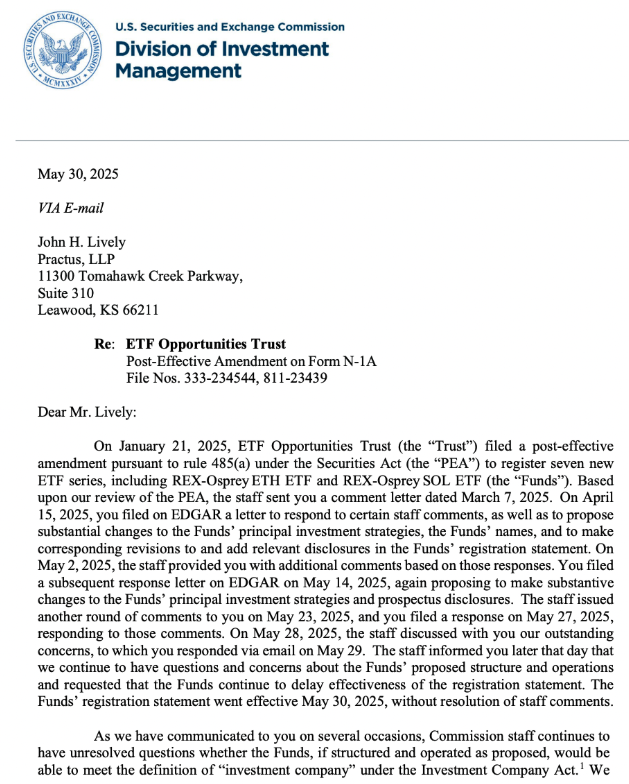 В прошлом месяце сотрудники регулятора сообщили REX Financial и Osprey фонды, которые стремятся запустить ETF -отслеживание Ether (ETH) и Solana (SOL) с участием, что средства с их текущей структурой могут не соответствовать определению инвестиционной компании, которая необходима для того, чтобы они перечислили для торговли.