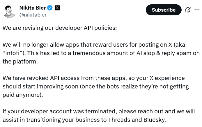 «Мы больше не будем разрешать приложения, которые вознаграждают пользователей за публикации на X (также известные как «инфофи»)», — заявил в четверг руководитель продукта X Никита Бир. «Это привело к огромному количеству ИИ-отбросов [и] ответного спама на платформе».