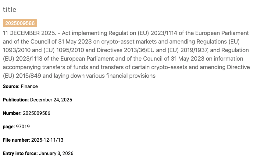 Хотя система MiCA вступила в полную силу в конце 2025 года, Бельгия до недавнего времени не принимала национальных законов, реализующих MiCA. По данным Belgian Official Gazette, государство-член опубликовало свой имплементирующий закон в декабре 2025 года, а MiCA вступил в юридическую силу в Бельгии 3 января 2026 года.