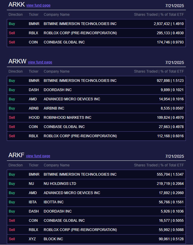 ETF Cathie Wood Innovation ETF, интернет -ETF Next Generation ETF и Fintech Innovation ETF продали 218 986 акций Coinbase (COIN) на сумму около 90,5 млн. Долл. США и 463 293 акций в игровой фирме ROBLOX (RBLX) на сумму 57,7 млн. Долл. США, согласно ежедневным торговым обновлениям в понедельник.