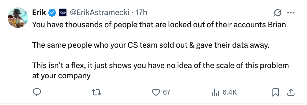 Некоторые отметили, что они были заблокированы из своего аккаунта в течение многих лет, и им не повезло их восстановить. «У вас есть тысячи людей, которые заблокированы из своих счетов, Брайан. Те же люди, которые ваша команда CS распродала и отдала свои данные», – сказал пользователь X Эрик Астрамеки.