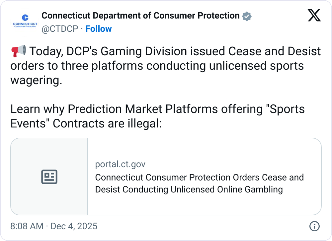 В своем заявлении DCP штата Коннектикут заявила, что платформы рынка прогнозов представляют серьезные риски для потребителей, поскольку им не хватает необходимых технических стандартов и средств защиты финансовых и личных данных.