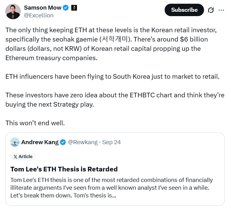 «ETH влиятельные лица летали в Южную Корею только на рынок в розницу. У этих инвесторов нет представления о таблице EthBTC и думают, что покупают следующую стратегическую игру», – сказал Мау в понедельник X Post, предупреждая, что это «не закончится хорошо».