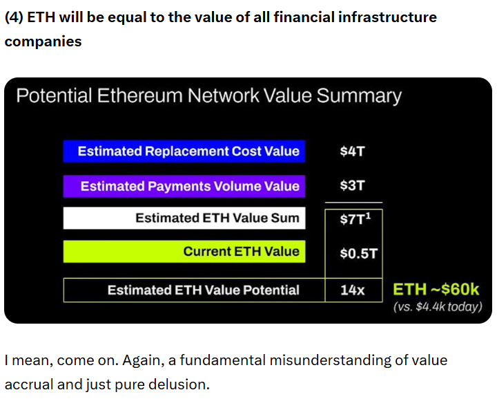«Оценка Ethereum происходит в первую очередь от финансовой неграмотности. Что, честно говоря, может создать прилично большую рыночную капитализацию», – сказал Кан в посте 24 сентября X, добавив, что «оценка, которая может быть получена из финансовой неграмотности, не является бесконечной».