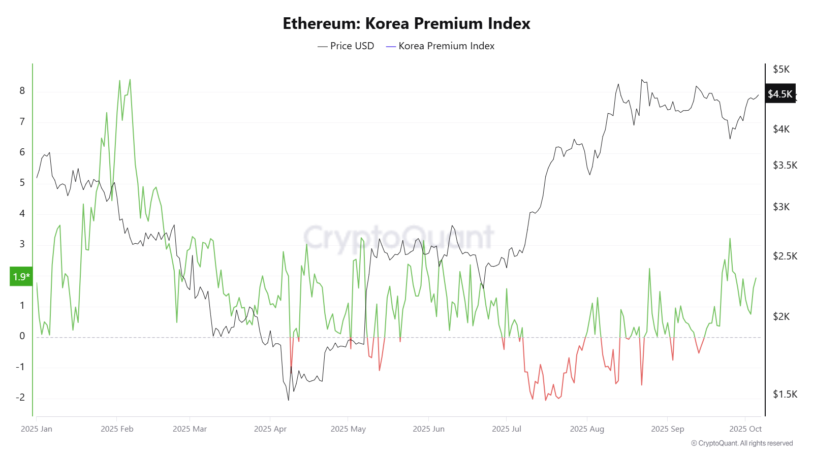 Этот показатель измеряет разрыв в цене для эфира между южнокорейскими биржами и другими.