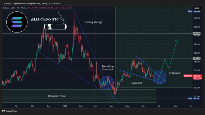 SOL торгуется в пределах месяца падающего клина. Источник: lluciano_btc на x