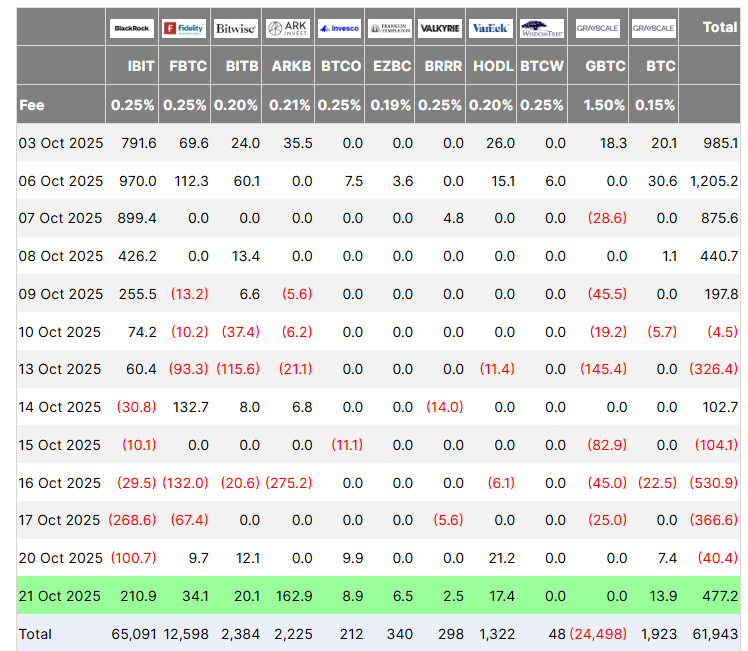 На этой неделе биткоин-ETF зафиксировали резкое восстановление потоков после нескольких дней политического оттока. По данным Farside Investors, во вторник фонды получили чистый положительный приток в размере $477 млн, прервав четырехдневную полосу неудач.