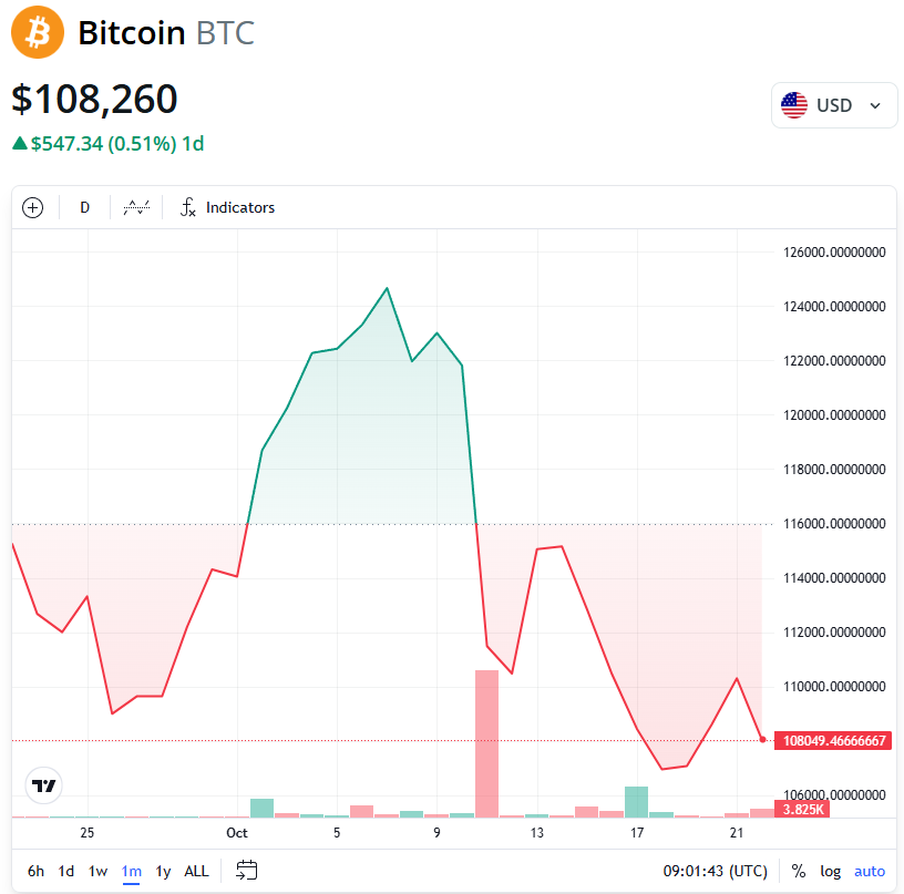 Биткоин упал на 6% за последний месяц и на момент написания торговался на уровне около 108 260 долларов, показывают данные Cointelegraph.