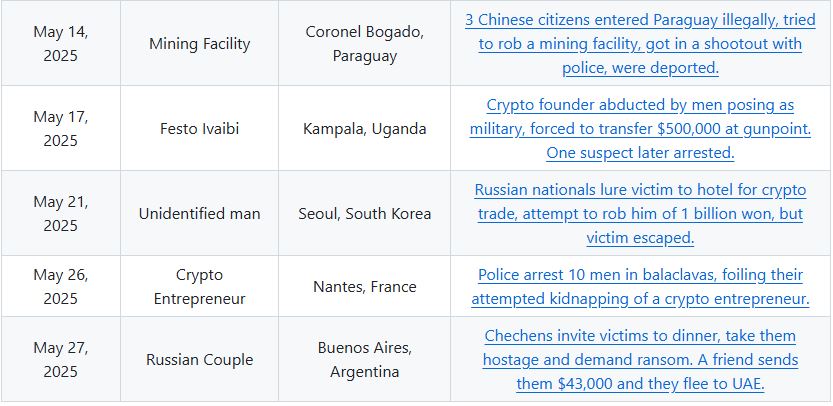Джеймсон Лопп, киферпанк и соучредитель самостоятельной фирмы CASA, создал список по записи GitHub, в которой говорилось о десятках офлайн-ограблений по всему миру, с 29 инцидентами личных крипторов, связанных с криптомидными кражами.