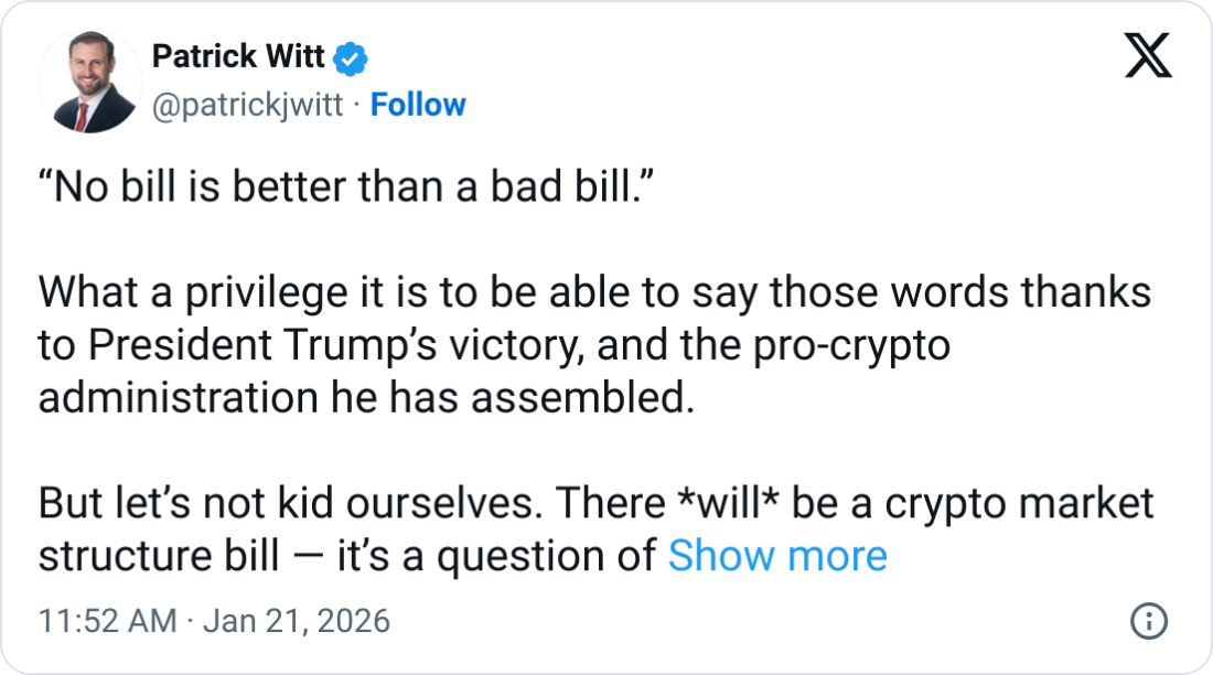 «Законопроект о структуре рынка криптовалют *будет* — вопрос в том, когда», — заявил во вторник Патрик Витт, исполнительный директор Президентского консультативного совета по цифровым активам.