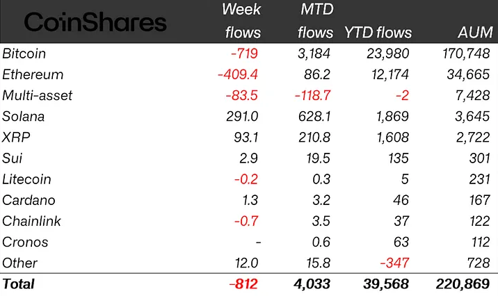 Глобальные продукты для обмена криптовалют (ETPS) зафиксировали 812 миллионов долларов от оттоков в течение недели по пятницу, заканчивая двухнедельный приток, сообщил Coinshares в понедельник.