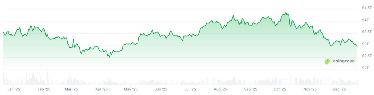 Тем не менее, рынки криптовалют находятся на пути к завершению года ниже, чем в начале: общая рыночная капитализация упадет более чем на 32% по сравнению с историческим максимумом в $4,4 трлн в начале октября и почти на 13% ниже, чем 1 января.