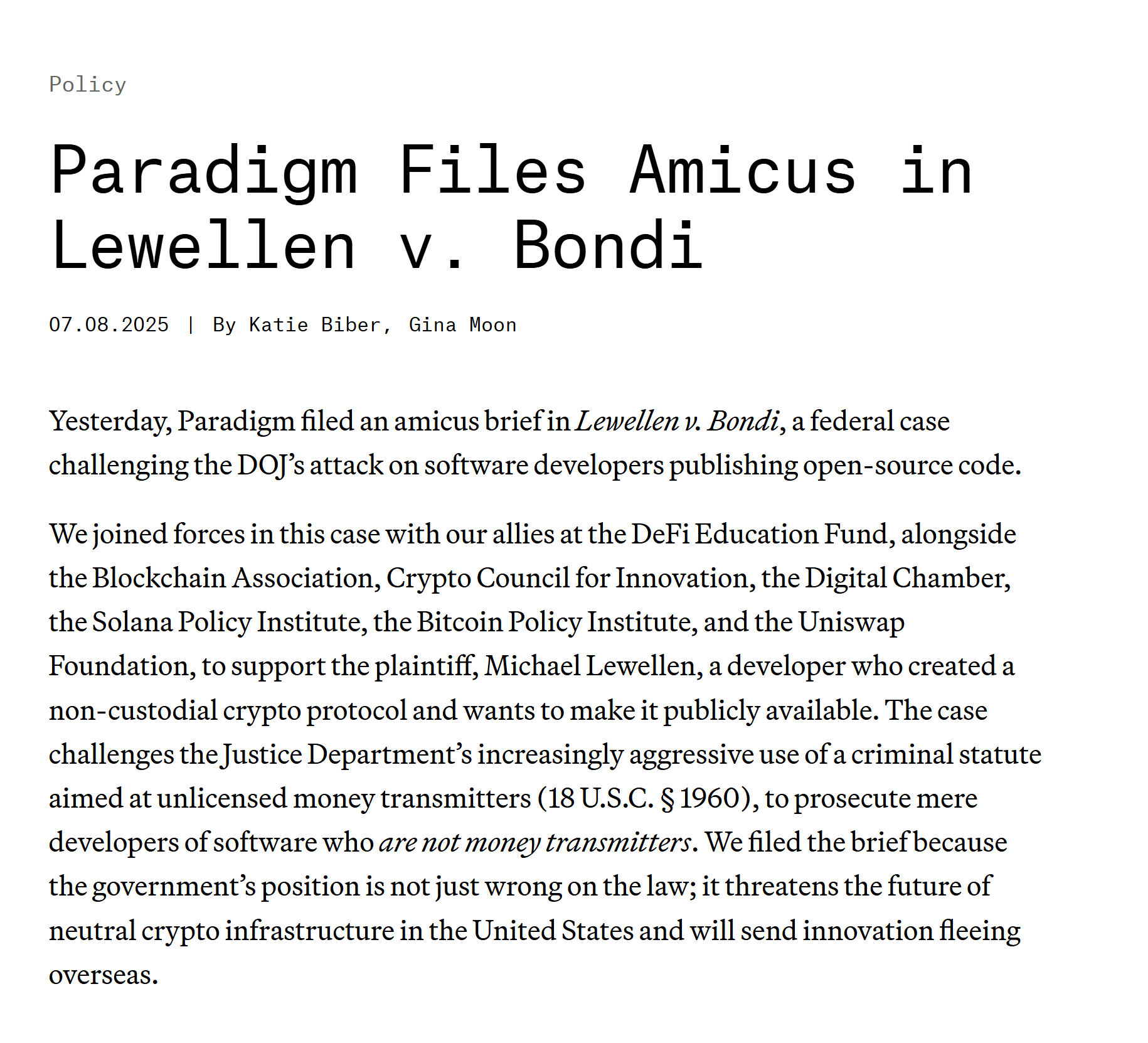 Парадигма инвестиций в криптовалюту, наряду с Фондом образования Defi, Ассоциацией блокчейн, Советом по криптовалюте для инноваций и других, подала в понедельник краткое изложение Amicus в поддержку Майкла Левеллена в случае Lewellen v. Bondi. Левеллен-разработчик, который создал неверный протокол DEFI и планирует публично выпустить его.