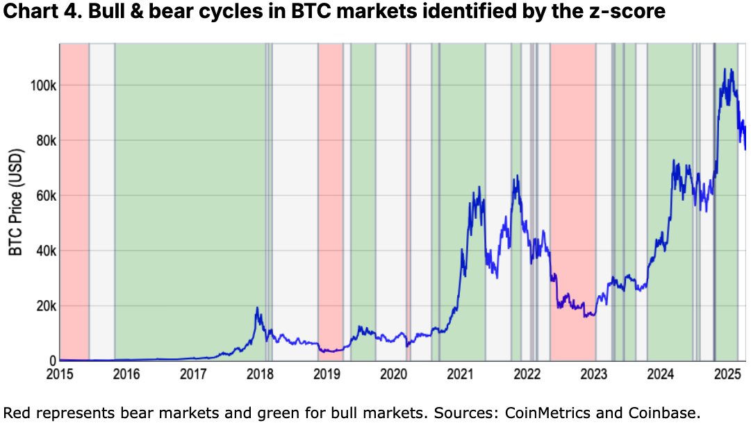 Этот показатель «естественно объясняет большую волатильность криптора», но он также медленно реагирует. Этот показатель имеет тенденцию генерировать мало сигналов на стабильных рынках. Модель Coinbase, основанная на нем, определила, что бычий рынок закончился в конце февраля, но с тех пор считает рынок нейтральным.