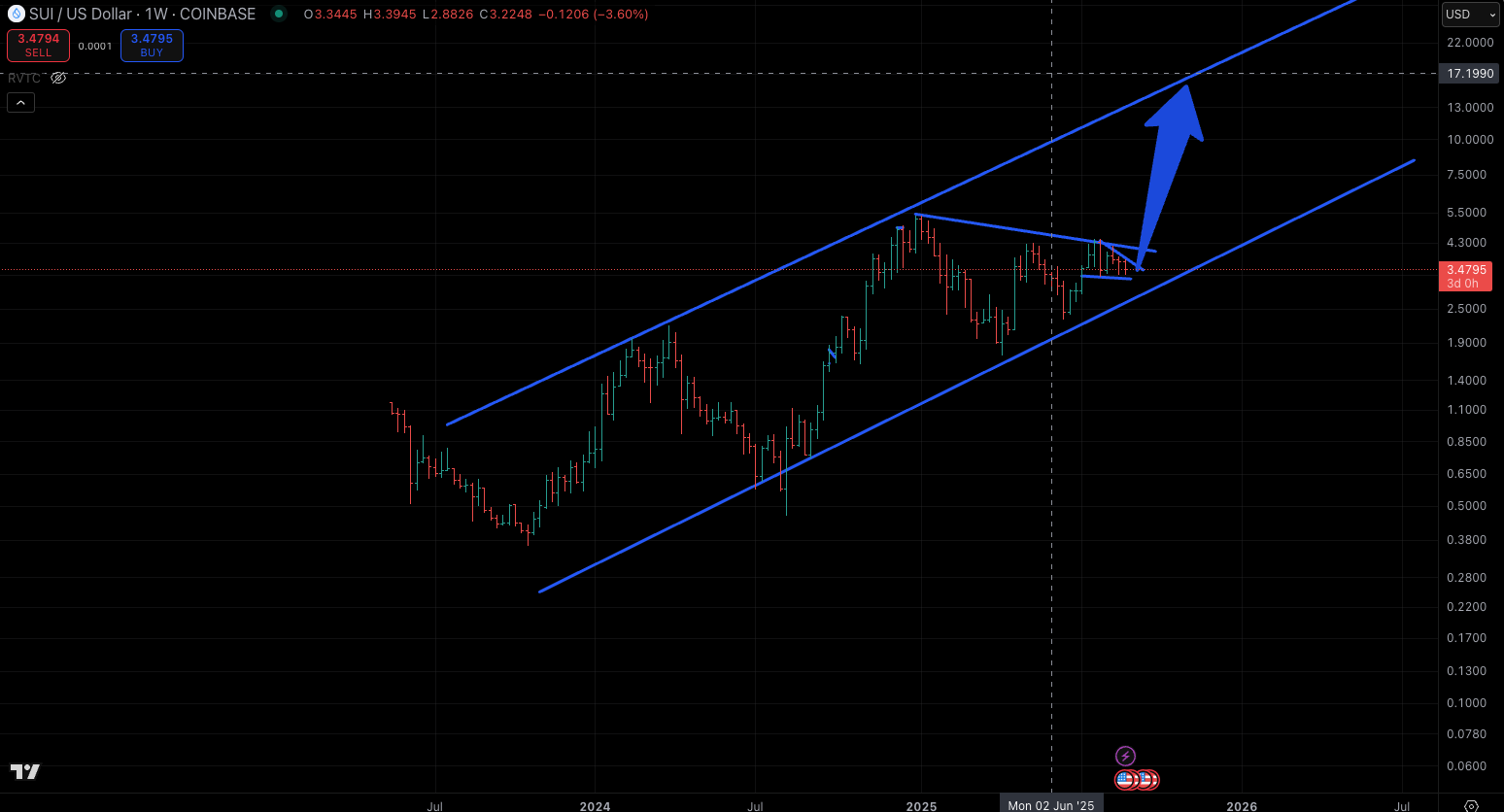 Диаграмма показывает восходящую паттерн треугольника, который рассматривается техническими трейдерами как бычья схема продолжения, сигнализируя о потенциальном прорыве цен при подтверждении.