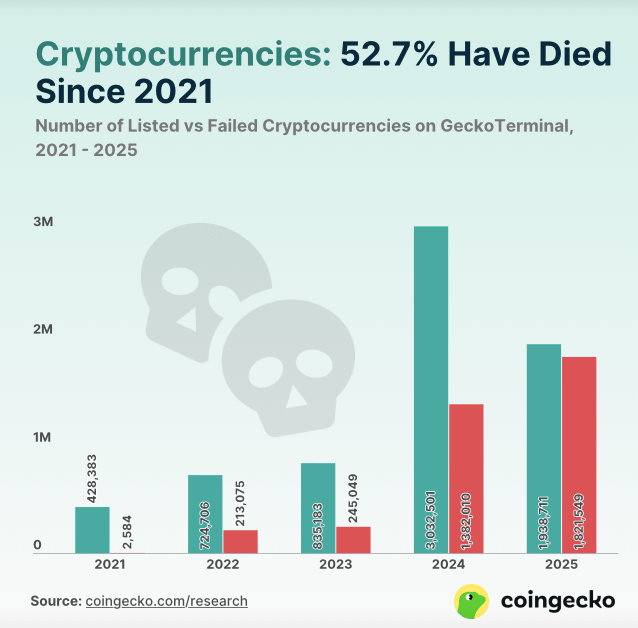 С 2021 года в трекере в режиме реального времени было указано почти 7 миллионов токенов, а 3,7 миллиона криптовалют больше не торговались, и считается, что они потерпели неудачу. В результате 52,7% всех исследованных криптовалют погибли, 86,5% провалились в период с 2024 и начале 2025 года.