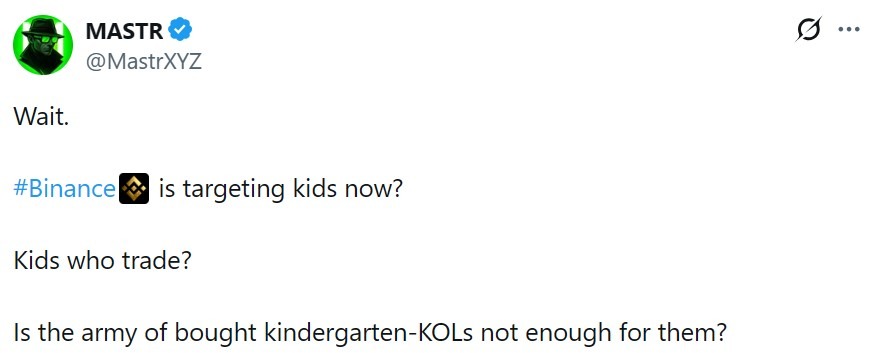 Пользователь One X раскритиковал Binance за «ориентацию» на детей, задаваясь вопросом, недостаточно ли существующих в отрасли маркетинговых усилий, ориентированных на молодежь.