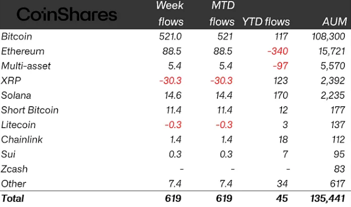 По сообщению CoinShares в понедельник, биржевые продукты для торговли криптовалютами (ETP) зафиксировали приток $619 миллионов, в первую очередь $521 миллион в инвестиционные продукты Bitcoin (BTC).