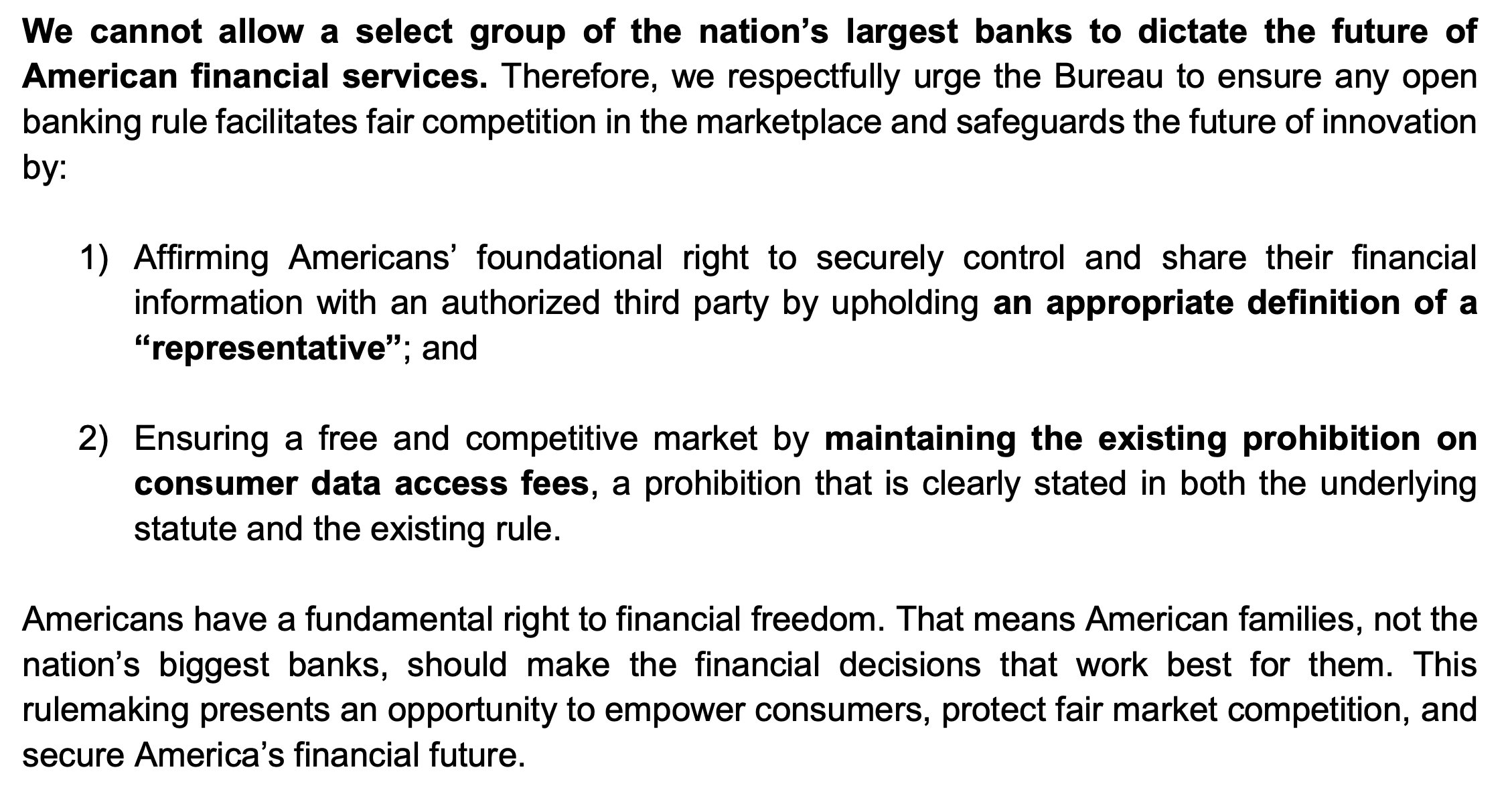 В письме утверждается, что «более 100 миллионов американцев» используют открытый банкинг для доступа к таким инструментам, как инвестиционные платформы, криптовалютные кошельки и приложения для цифровых платежей, для управления своими финансами и ведения бизнеса.