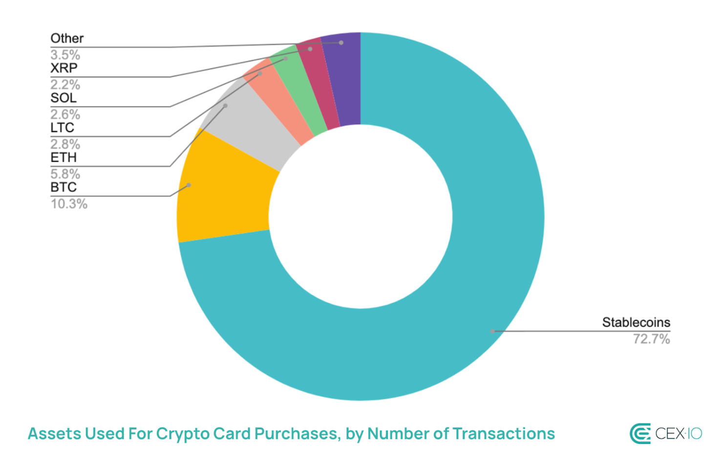 Образцы расходов показывают, что владельцы карт криптовалюты используют свои карты для повседневных расходов. Согласно данным cex.io, продукты составляют 59% покупок, около 54% ЭКБ, в то время как столовые и бары составляют 19%, что выше среднего для личных продуктов питания и напитков.