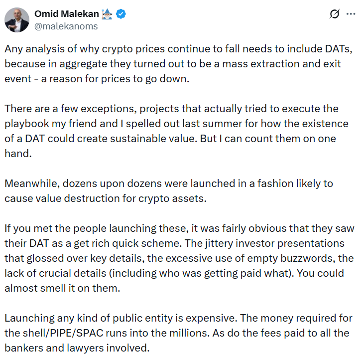 «Любой анализ того, почему цены на криптовалюты продолжают падать, должен включать DAT [казначейские активы цифровых активов]», — сказал Малекан в посте X во вторник. «В совокупности они оказались событием массовой добычи и выхода — поводом для снижения цен».