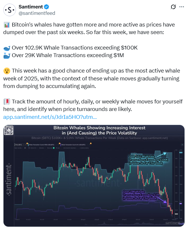 Увеличение активности китов происходит одновременно с падением цен на криптовалюту, сообщил Сантимент в посте X в среду.