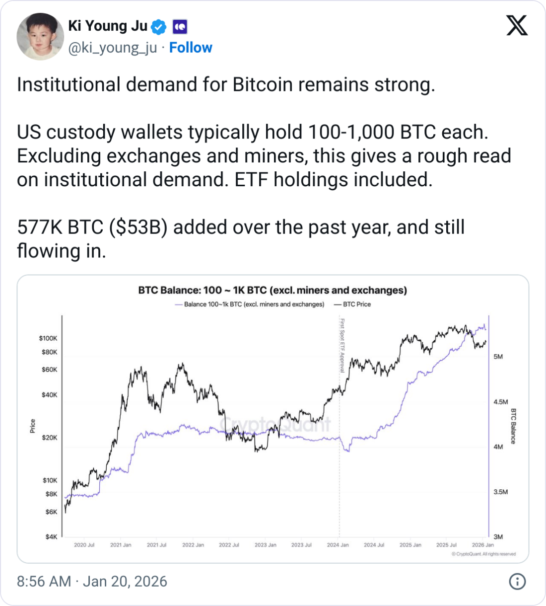 В среду CryptoQuant Ки Ён Джу указал на 577 000 Биткоин (BTC), которые институциональные фонды накопили за последний год, что эквивалентно примерно 53 миллиардам долларов.