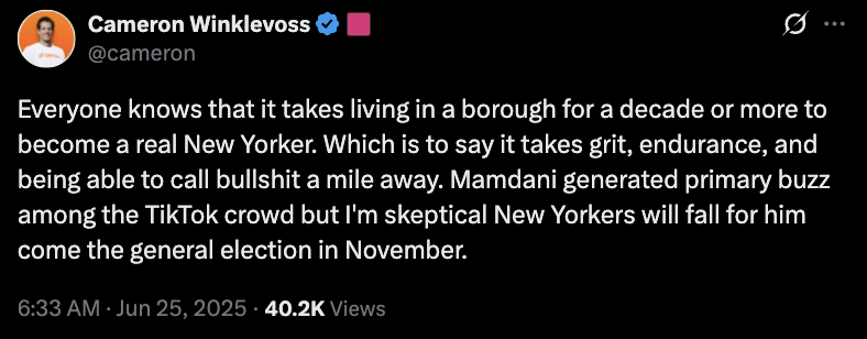 С момента своей основной победы Мамдани столкнулся с общественной оппозицией со стороны важных фигур в индустрии криптовалюты, включая соучредителя Близнецов Кэмерон Винкльвосс. Тайлер Винклвосс также выпустил идею «Получить [Ting], вовлеченную в гонку мэра Нью -Йорка», что предлагает финансовую поддержку кандидату на победу над Мамдани.