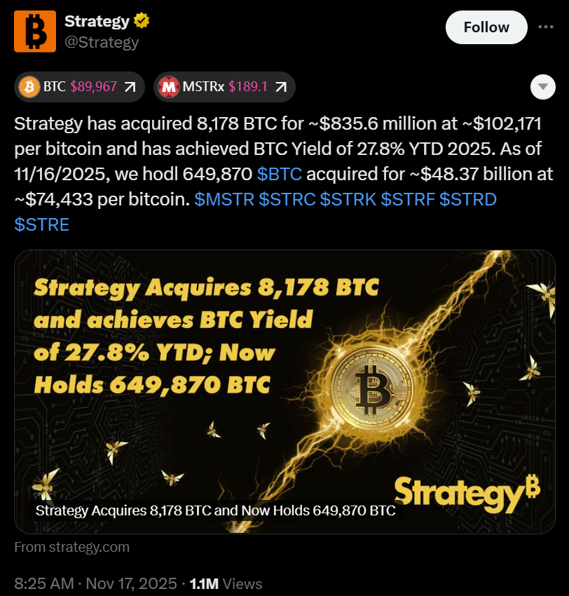 Бизнес-аналитическая компания, ставшая казначеем Биткоин, Strategy попала в заголовки газет на этой неделе после объявления о приобретении дополнительных 8 178 BTC за 835,6 миллиона долларов по средней цене 102 171 доллар за биткоин. Это крупнейшая покупка компании с июля.