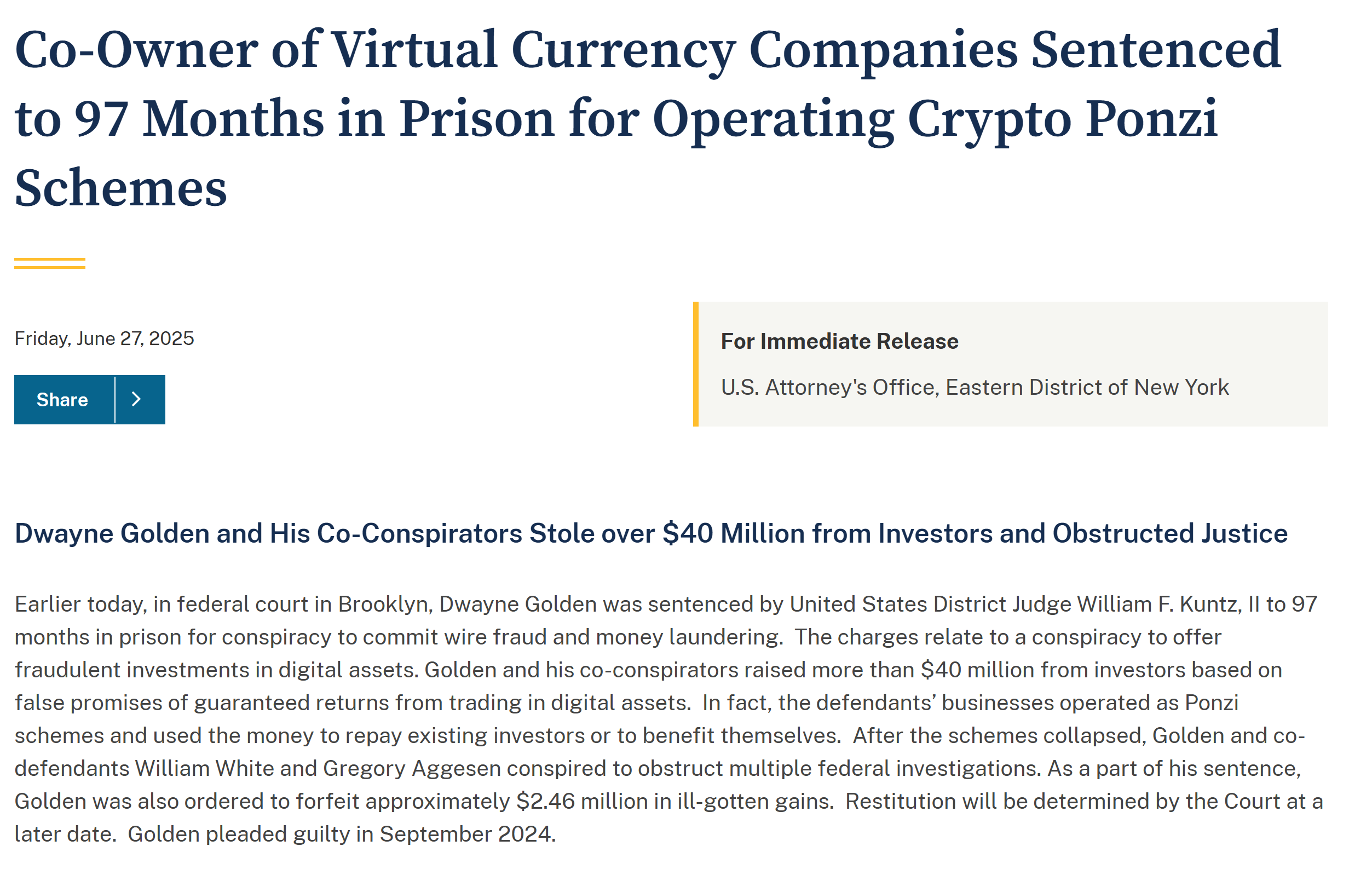 57-летний Дуэйн Голден был осужден за мошенничество с проволокой и отмывание денег за свою роль в организации мошенничества через три цифровые активы, EmporeChoin, Ecoinplus и Jet-Coin, которые обманули инвесторов из более чем 40 миллионов долларов, объявил Министерство юстиции (DOJ).