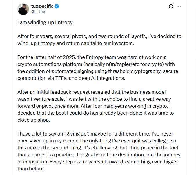Основатель и генеральный директор Entropy Тукс Пасифик в субботу сообщил X, что платформа автоматизации криптовалюты не имеет жизнеспособного пути вперед после многих лет работы.