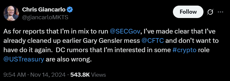 Однако, вскоре после выборов, Джанкарло отменил слухи о том, что он сменит исходящего председателя Комиссии по ценным бумагам и биржам Гэри Генслер. Он также выстрелил в сообщения, что он интересовался крипто-связанной ролью в Казначействе США.