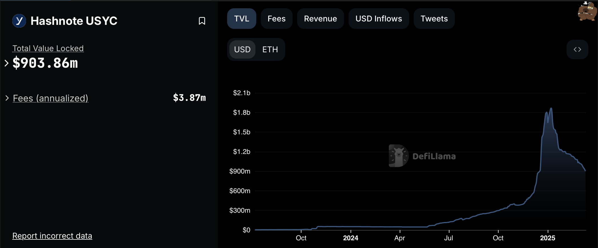 По данным Defillama, Hashnote, который Circle приобрел в январе 2025 года, является эмитентом USDY, крупнейшего фонда казначейства и денежного рынка, общей стоимостью (TVL) в размере 900 миллионов долларов. ТВЛ фонда упал с 1,9 миллиарда долларов по состоянию на 7 января.