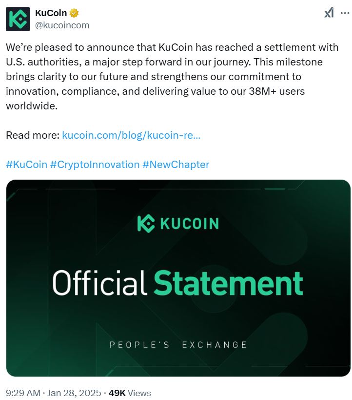 Peken Global Limited, действующая в качестве Kucoin, вступила в свою вину в федеральный суд Манхэттена в рамках соглашения об урегулировании, сообщил Министерство юстиции 27 января.