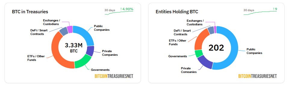 Данные показывают, что публичные компании в настоящее время являются крупнейшими институциональными держателями Биткоин после биржевых фондов (ETF).