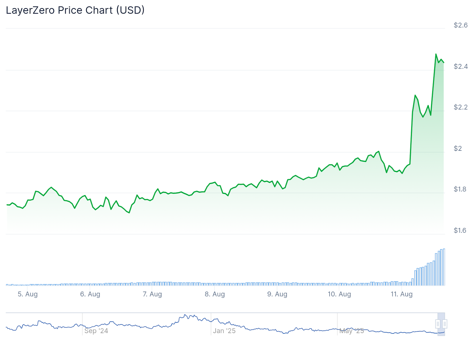 За последние 24 часа токен Layerzero приобрел более 23% до 2,44 доллара, что сделало его одним из крупнейших победы на рынке криптовалют в прошлый день, согласно Coingecko.