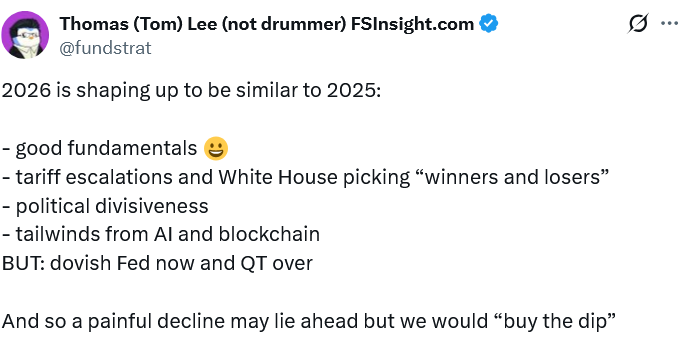 В интервью во вторник подкасту The Master Investor с Уилфредом Фростом Ли сказал, что 2026 год будет зеркальным отражением 2025 года с попутным ветром для отраслей блокчейна и искусственного интеллекта, но отметил, что риски, связанные с тарифами и политическими разногласиями, на начальном этапе будут удерживать рынок от устойчивого ралли.