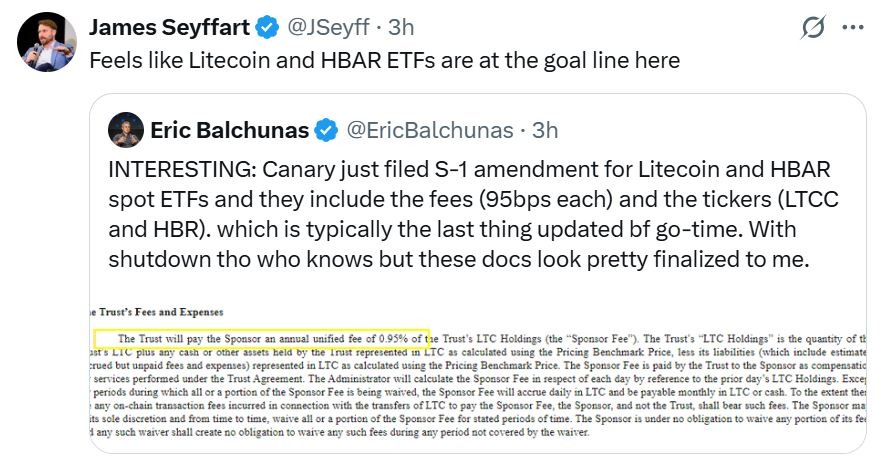 Менеджер активов Canary Capital, по-видимому, находится на пороге того, что его обменные фонды Litecoin и HBAR (ETF) были утверждены после подачи ключевых окончательных деталей, но вряд ли они будут запущены, пока правительство США будет закрыто.