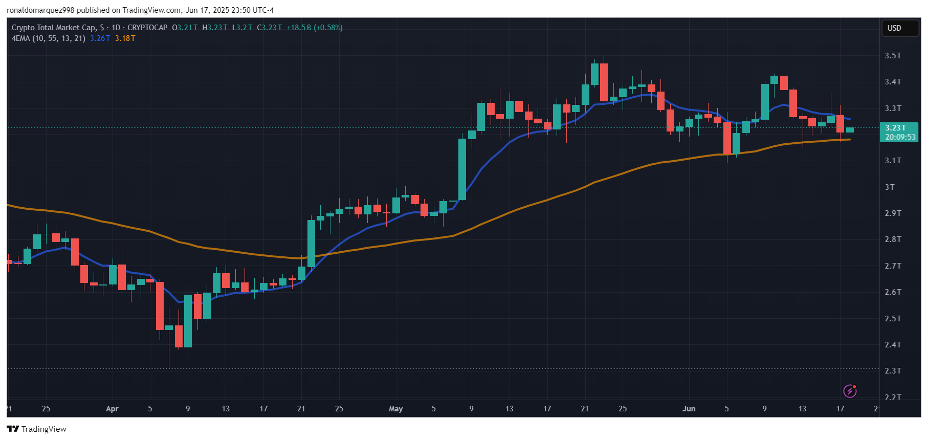 Ежедневный диаграмма показывает общую рыночную капитализацию криптовалют в 3,23 триллиона долларов. Источник: Итого на TradingView.com