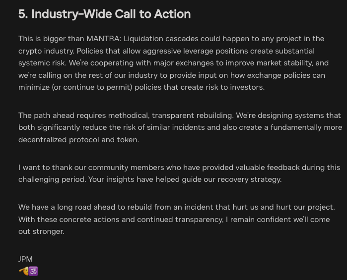 Помимо вызова глобальных централизованных бирж для рассмотрения их политики рычага, Mantra перечислила несколько ключевых решений после аварии OM.